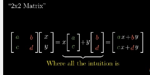 I versori di partenza, ad esempio, vengono scritti quindi î = [1, 0] e ĵ = [0, 1] mentre la matrice di trasformazione lineare in 2 dimensioni sarà [a b, c d]