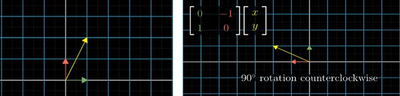 Una seconda trasformazione è la rotazione. Ad esempio la rotazione di 90° antioraria, applicata al vettore giallo [x, y] è espressa dalla matrice [0 1, -1 0].