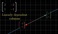 Se le 2 colonne della trasformazione sono linearmente dipendenti, significa che i due versori î, ĵ non sono più ortogonali e non possono più rappresentare un piano. Ne segue che le due dimensioni collassano su una sola, ossia il piano diventa una retta e qualsiasi vettore del piano finisce sulla retta. Il legame tra matrici e dimensioni è fondamentale. Come abbiamo già visto ogni riga della matrice rappresenta una dimensioneo dello spazio vettoriale. Nella figura le due colonne non sono linearmente indipendenti perché la seconda altro non è che la prima moltiplicata per -1.