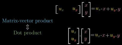Ma qualcuno potrebbe notare che queste 2 combinazioni lineari possono interpretarsi come 2 prodotti scalari (“dot products”), il primo tra i vettori [a, c] e [x, y], e il secondo tra i vettori [b, d] e [,x y].