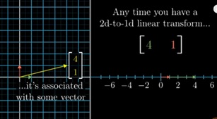 Nella figura sottostante vediamo che il vettore [4, 1] può diventare la matrice di una trasformazione lineare che trasforma il versore î nel versore trasformato [4] e il versore ĵ nel versore trasformato [1].
