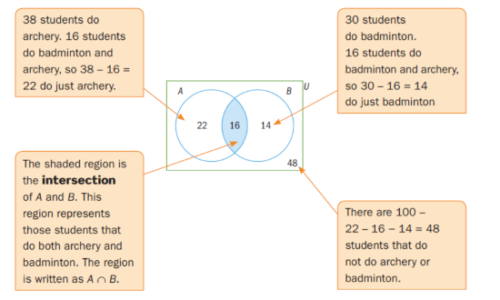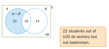 Torniamo al diagramma di Venn che mostra gli studenti che fanno tiro con l'arco (A) e quelli che fanno Badminton (B).
