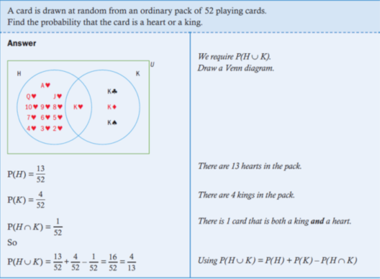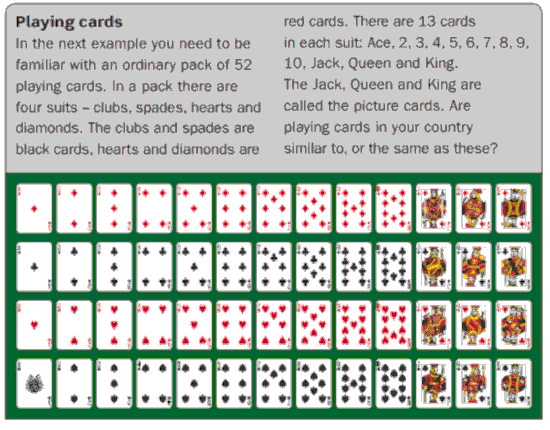 L'uso del mazzo da 52 carte è un classico per fare molti esempi di applicazione delle varie regole nello studio delle probabilità. Il suddetto mazzo costituisce qui lo Spazio campione.