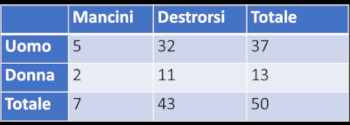 La tabella seguente mostra il numero di giocatori di ping pong destrorsi e mancini in un campione di 50 maschi e femmine.