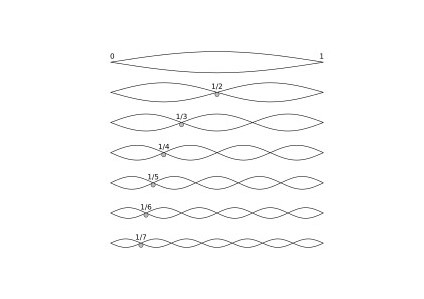 Le onde stazionarie hanno a che fare per loro natura con i numeri interi. Lo vediamo, ad esempio, in una corda elastica ideale di lunghezza L fissata agli estremi. L’energia impulsiva che riceve, per esempio percuotendola o pizzicandola, genera onde stazionarie che non possono avere altro che un numero intero n di periodi, le cui lunghezze d’onda λ saranno 2L, L, L/2, L/3, … L/n a cui corrisponderanno altrettante frequenze fn = vn/2L con n= 1, 2, 3…, dove v è la velocità di propagazione nel materiale della corda (modi oscillatori normali alla corda), che dipende dalla sua densità lineare e dalla sua tensione. Nella figura si vedono ventri e nodi. Poiché la corda è fissata ai 2 estremi, in quei 2 punti devono esserci 2 nodi.