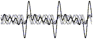 forme d'onda di un accordo disssonante fatto di 3 suoni (linea spessa = somma dei 3 suoni, linee sottili singoli suoni)