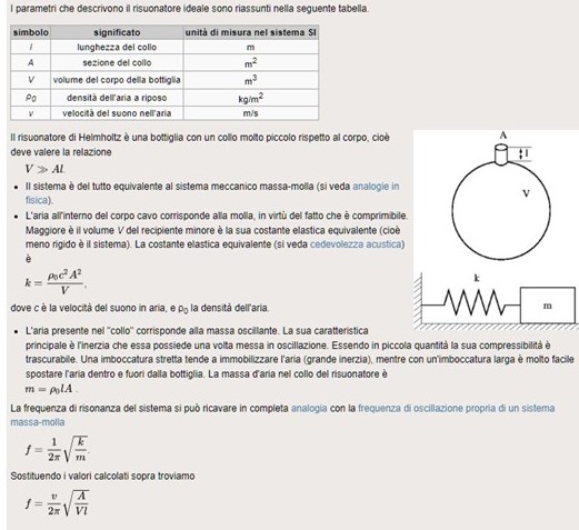 Esso è costituito da un’ampolla sferica e da un piccolo condotto pseudocilindrico. Lo studio fisico dimostra che la risonanza è originata dal collo del risonatore, in cui l’aria si comporta come un sistema costituito da una “massa” (un corpo pesante) e da una “molla”. La “massa” è l’aria contenuta nel cilindro, mentre la “molla” è l’aria contenuta nel recipiente sferico; maggiore è il volume del recipiente, maggiore è la“cedevolezza” del volume d’aria (la cedevolezza massima è quella dell’aria aperta), minore è la frequenza di risonanza principale (quella più bassa).