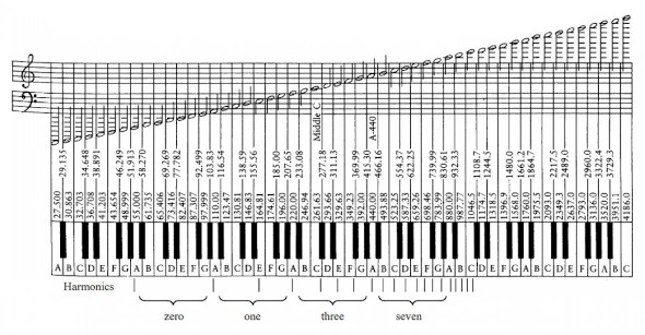 Mentre i rumori e i suoni modulati possono dare vita a un ritmo, la musica (sempre ad eccezione della musica colta dal ‘900 in poi) si caratterizza soprattutto per l’uso dei suoni armonici, il cui parametro maggiormente distintivo è l’altezza (o “acutezza”),che fisicamente corrisponde alla frequenza fondamentale. Per poter giocare piùfacilmente con le altezze, i musicisti ne hanno estratte alcune dal continuum frequenziale sonoro, rendendole privilegiate. Già gli antichi Greci avevano codificato altezze simili a quelle moderne, ma nel tardo medio evo si sono stabilizzate prima sei e poi sette altezze privilegiate o “note”, che i popoli latini chiamano con i famosi nomi dati da Guido d’Arezzo, Do, Re, Mi,Fa, Sol, La, Si, e che gli anglosassoni nominano con le prime lettere dell’alfabeto, da A a G (A = La, B = Si, C = Do, etc.). Sette note che, con l‘aggiunta delle cosiddette “note alterate” con diesis e bemolli, all’incirca dal ‘700 in poi sono diventate 12. In realtà privilegiate non sono propriamente le altezze, ma lo è la “scala musicale”, ossia una successione di frequenze fondamentali crescenti che stanno tra loro a due a due in certi rapporti numerici, quelli che si rivelano favorevoli alla percezione. Il più semplice è il rapporto = 2, che è anche quello più consonante di tutti, tanto che se le due note suonano simultaneamente quasi non si distinguono: in questo caso si dice che le due note distano di “un’ottava”. In musica infatti, la distanza non è una differenza di frequenza ma un rapporto, dato che la successione delle note è logaritmica. Altri rapporti consonanti sono 3/2 e 5/4: al numeratore ci sono le armoniche e al denominatore le potenze di 2, che servono a riportare le armoniche “in banda base”, ossia all'interno dell’”ottava” a cui appartiene la prima nota. La musica utilizza circa 7ottave, dove il Do della prima ottava, detto Do1 (C1), nel sistema temperato equabile con La4 = 440 Hz, ha la frequenza fondamentale di 440*2−33/12 = 32,7 Hz circa (perché il Do1 si trova 33 semitoni sotto al La4); quindi Do1 = 32,7*20, Do2 = 65,4 = 32,7*21 Hz, …, Do8 =32,7*27 = 4185 Hz. Il Do8 è la nota più acuta utilizzata ed è l'ultimo tasto del pianoforte . Mi scuso se quest’ultimo discorso appare poco chiaro, ma non so spiegarlo senza usare molte più parole: in sintesi stavo cercando di spiegare come le note della scala derivino dagli armonici. Esse furono individuate (pare) da Pitagora, che, non conoscendo il fenomeno degli armonici, notò le relazioni di consonanza tramite i rapporti di lunghezza di una corda tesa.