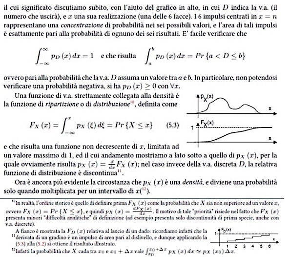 Abbiamo visto sopra il concetto di "densità di probabilità", che è una funzione dei valori della variabile aleatoria: ad ogni valore della variabile corrisponde un valore di probabilità. Se in valori di della variabile a. sono in numero finito, come nel caso del lancio del dado, la densità di probabilità (d.d.p.) è per forza espressa tramite impulsi matematici, perché essa è composta da altrettanti valori isolati. Se invece la variabile a. è continua, cioè assume infiniti valori all'interno di un intervallo, allora anche la d.d.p. è continua ("quasi dovunque" per completezza: potrebbero esserci anche valori isolati insieme a valori continui).
