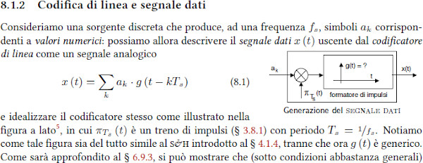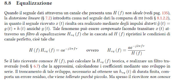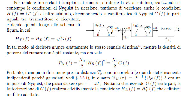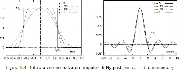 I dati in banda base si trasmettono tramite un asuccessione di impulsi g(t) che devono ridurre la probabilità di errore proteggendo la trasmissione da due insidie: - rumore additivo - interferenza intersimbolica Delle due, la seconda è la più difficile da combattere quando il canale è costituito da una linea fisica a causa delle limitazioni di banda (la situazione si inverte per le trasmissioni radio). La difficoltà nasce dalla contraddizione tra limitazione in banda (che implica un durata infinita) e limitazione nel tempo (che implica una banda infinita). Un altro elemento di difficoltà è l'imprecisione del clock in ricezione. Per mimimizzare la contraddizione suddetta gli impulsi g(f) devono soddisfare le cosiddett condizioni di Nyquist: - nel tempo: g(t) deve passare per lo zero negli istanti multipli di Ts (durata del simbolo) e deve essere = 1 per t = 0 - in frequenza: G(f) deve manifestare simmetria dispari rispetto a fs/2 (frequenza di simbolo o "symbol rate"). Un filtro che soddisfa le suddette condizioni è il filtro a coseno rialzato.
