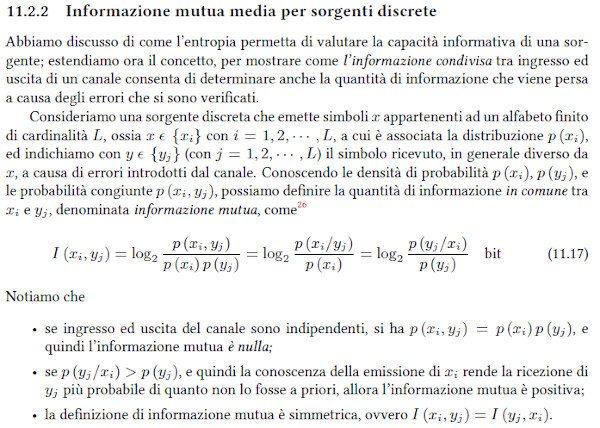 L'informazione mutua usa il concetto di probabilità condizionata, ossia la probabilità dell'evento B dato che sia accaduto l'evento A. Ad esempio, dato un mazzo di 52 carte da gioco, qual è la probabilità che, avendo estratto una carta di cuori (evento A), la carta sia un asso (evento B)? La probabilità condizionata si indica con p(B/A). L'evento congiunto "asso di cuori" ha probabilità p(a)p(B/A) che in questo caso è 1/4*1/13 = 1/52. Se l'evento B non dipende da A, i due eventi sono statisticamente indipendenti e p(B/A) = p(B) e la probabilità dell'evento congiunto p(A,B) = p(A)*p(B).