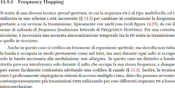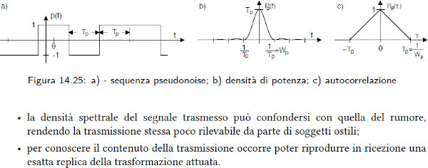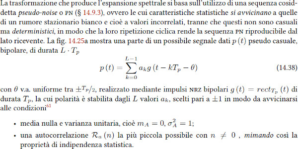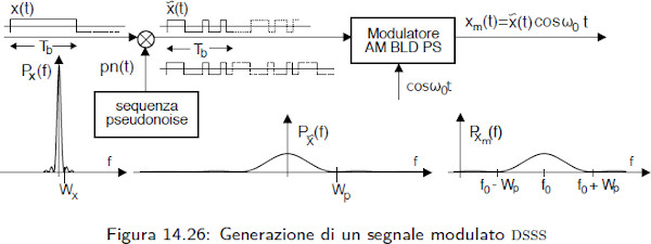 Il segnale Ẍ(t) = x(t)•pn(t) [x con ~ sopra, nella figura 14.26] è chiamato segnale allargato perchè la sua potenza è la stessa di x(t) ma è spalmata sulla banda di pn(t).