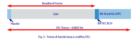 - - Tecnica di suddivisione dei dati in trame (frame) di banda base (BBFRAME) e codifica di canale (FEC) analoghe a quella del DVB-S2.