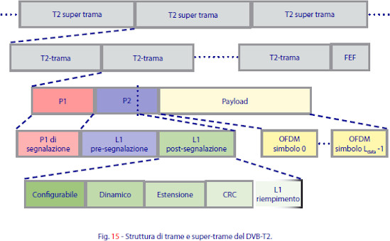 Il segnale DVB-T2 è progettato in modo tale dafacilitare la sincronizzazione dei ricevitori in tempo e frequenza. Ciascuna trama è suddivisa in preambolo e payload, così come riportato graficamentein figura 15. Il preambolo è costituito da un simbolo denominato P1 e da un certo numero di simboli P2, dipendente dalla dimensione della FFT utilizzata: per sistemi con 32K e 16K vi è solamente un simbolo P2; per sistemi 8K, 4K, 2K e 1K sono presenti rispettivamente 2, 4, 8 e 16 simboli P2. Segue il payload vero e proprio, (anche se alcuni dati possono essere già trasportati da simboli P2) che consiste di simboli OFDM le cui sottoportanti possono essere modulate da simboli di dati o da simboli pilota predefiniti.