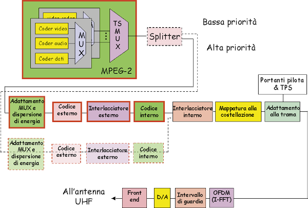 Gli elementi indicati con un bordo rosso nel diagramma a blocchi di figura 1 sono comuni al sistema DVB-S. Essi includono: la struttura di trama (derivata dal Multiplatore di Trasporto MPEG-2), la dispersione dell’energia del segnale per uniformare la distribuzione spettrale all’interno del canale RF, una sofisticata tecnica di protezione dagli errori tramite concatenazione di un codice esterno con un codice interno a tasso di codifica variabile mediante processo di interlacciamento. Il codice esterno è il Reed-Solomon RS(204,188, t=8) accorciato, derivato dall’originale codice sistematico RS(255,239, t=8). I codici interni sono convoluzionali punturati, basati su un codice convoluzionale madre a tasso 1/2 con 64 stati. Oltre al codice madre, il sistema permette i tassi punturati di 2/3, 3/4, 5/6 and 7/8. L’interlacciatore è basato sul processo di interlacciamento convoluzionale di Forney ed ha profondità pari a 12.