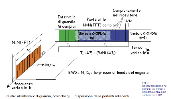 Il principio su cui si basa questa tecnica di modulazione consiste nel distribuire il flusso dati totale tra moltissime portanti (a banda stretta e quindi a bassa velocità di trasmissione) equispaziate in frequenza, all’interno della banda del canale di diffusione (figura 3). A ciascuna delle portanti è applicata la modulazione digitale QPSK, M-QAM, ecc...; la mutua ortogonalità è garantita per una spaziatura in frequenza tra le portanti pari alla velocità di simbolo, 1/Tu. Il processo OFDM è attuato per mezzo di una I-FFT (Inverse Fast Fourier Transform).”