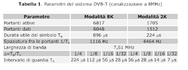 I parametri principali del sistema DVB-T sono riportati in Tabella 1. Il sistema è ottimizzato per canali a 8 MHz (spaziatura di canale in UHF), ma può essere adattato anche su canali da 7 MHz (utilizzati in molti paesi, tra i quali l’Italia) e da 6 MHz (spaziatura adottata in USA e Giappone), modificando opportunamente la frequenza di campionamento nel ricevitore, Le tre possibili spaziature di canale in frequenza sono state introdotte nella specifica al fine di permettere la più vasta adozione del sistema DVB-T.