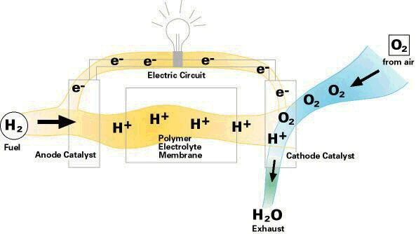 L'idrogeno fornito all'anodo reagisce, liberando elettroni. La corrente che ne risulta fluisce attraverso un circuito esterno verso il catodo, dove gli elettroni si combinano con l'ossigeno. Il flusso di ioni attraverso l'elettrolita completa il circuito, e il solo prodotto di scarto è acqua. In linea di principio si possono usare altri combustibili oltre all'idrogeno ma i prodotti di reazione deteriorano il catalizzatore, riducendo la tensione in uscita e l'efficienza.