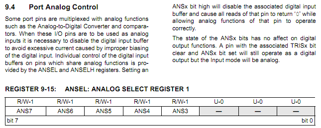 Per far questo andiamo a controllare il datasheet e troviamo in un riquadrino evidenziato nei capitoli delle porte (capitolo: “I/O Ports”) l'indicazione di quali porte sono analogiche. Il riferimento ad un registro “ANSEL” lo trovate successivamente. Se andiamo a vedere questo registro scopriamo che è proprio il registro adibito alla selezione della modalità di funzionamento di queste porte.