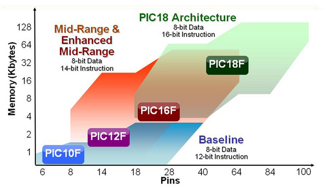 Le prime 4 famiglie (10F-->18F) sono tutti dispositivi a 8 bit. Le successive 4, sono famiglie che dispongono di processori a 16 bit in cui le famiglie dsPIC sono specifiche per l'implementazine di filtri digitali. Infine PIC 32F sono i più potenti tra i vari PIC.
