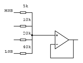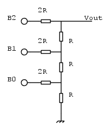 In questo circuito si divide il bit più significato per R, il secondo bit per 2R, il terzo bit per 4R e così via ottenendo la stessa formula di prima: apposto di moltiplicare per numeri sempre più grandi si divide per numeri sempre più piccoli.
