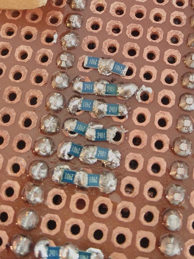 Queste sono le 2R ossia la serie di due resistori uguali. La R singola è stata saldata tra le piazzole. Il tutto direttamente sotto il micro.
