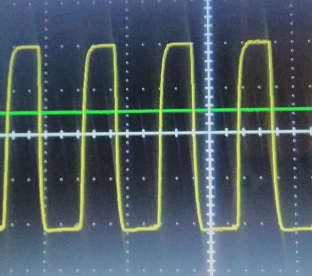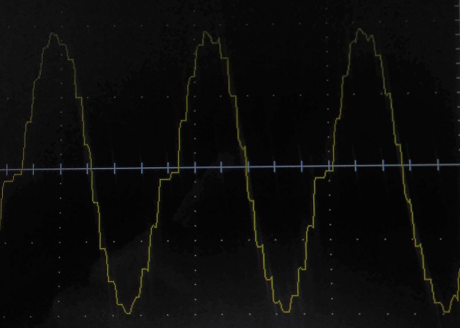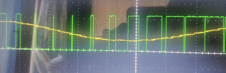 sinusoide generata con PWM, si nota come verso sinistra l'onda quadra abbia un dity cicle molto piccolo e infatti il seno si abbassa, poi sulla destra quando il duty cicle aumenta anche il seno.