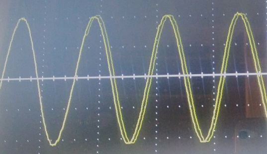 seno a 10kHz (l'oscilloscopio è scarso davvero e l'onda balla un po', si vede la sovrapposizione nella foto come se fosse doppio)