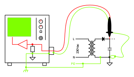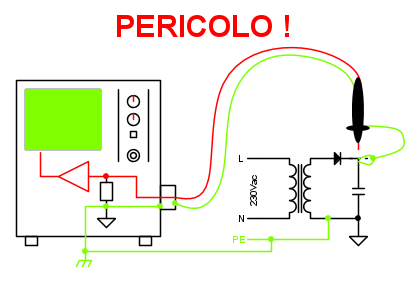In questo caso devo porre molta attenzione al coccodrillo della sonda dell’oscilloscopio che devo posizionare necessariamente al potenziale di riferimento del circuito in bassa tensione; se per sbaglio ponessi il coccodrillo su un punto non a potenziale zero creerei un passaggio per la corrente a bassa impedenza (un corto circuito in pratica) attraverso la calza del cavo coassiale verso terra con conseguente possibili pericoli per l’operatore e per l’oscilloscopio.