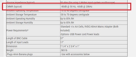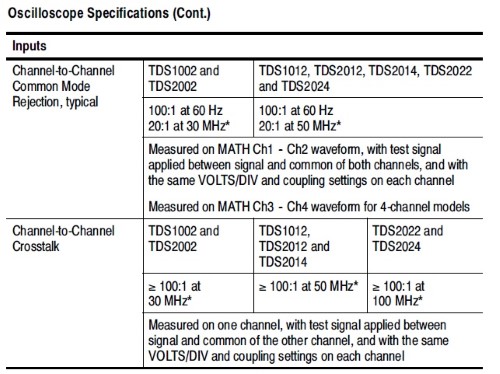 Di seguito un estratto dalle specifiche tecniche del mio oscilloscopio Tektronix TDS2014 per vedere come si comporta con questo tipo di misure differenziali.