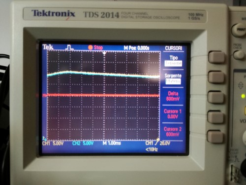 Nella foto di seguito quanto misurato. Ho prima fatto la differenza delle due tensioni presenti sui due canali dell'oscilloscopio (traccia rossa) e usato la funzione cursore.