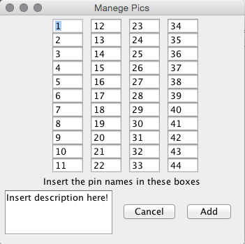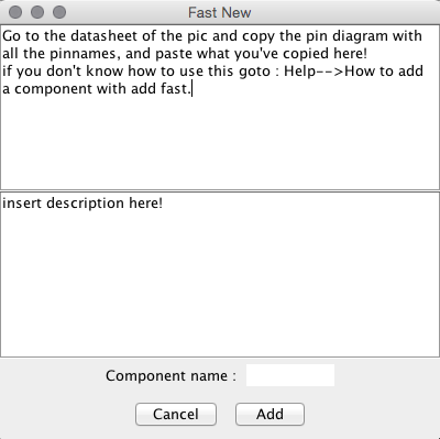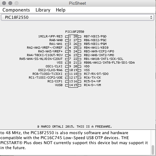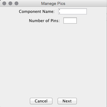 -Non bisogna usare nessun editor per creare un nuovo componente; il programma creerà automaticamente il package (per ora solo in PDIP/DIP di qualsiasi dimensione fino a 44 pins) avendo io creato un'applicazione ibrida, metà applet e metà grafica, la parte grafica provvederà a creare l'immagine del pic con i suoi piedini e nomi.