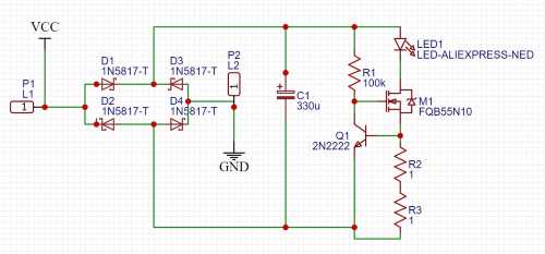 Come potete vedere dallo schema [4] abbiamo la parte di sinistra, composta dai diodi D1-4 (che formano un full bridge rectifier) e da C1 che hanno lo scopo di fornirci una tensione di alimentazione continua e ridurre il ripple. Il resto dei componenti invece formano il limitatore di corrente a contro reazione.