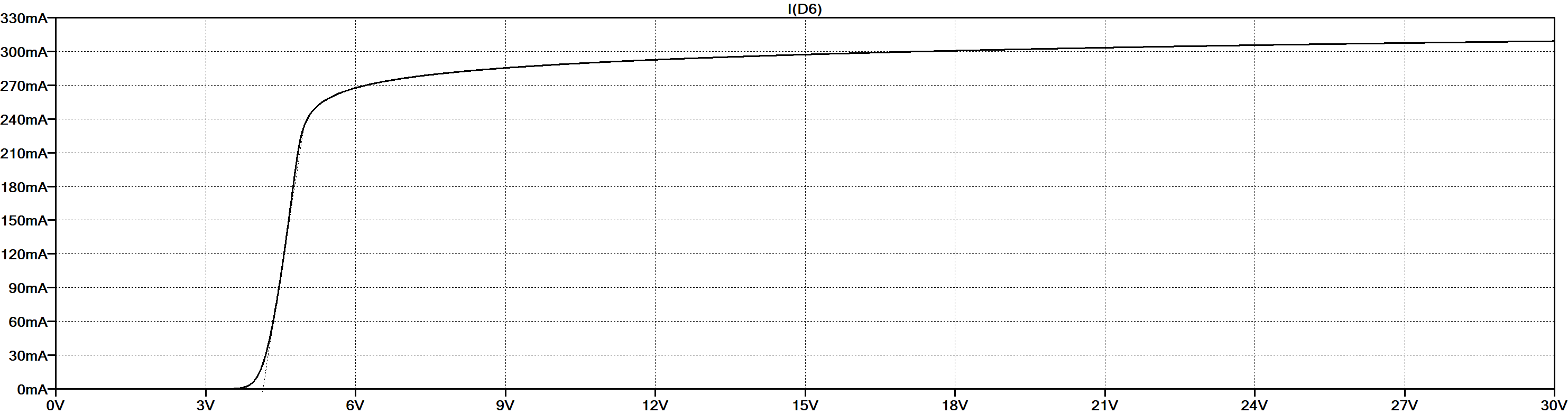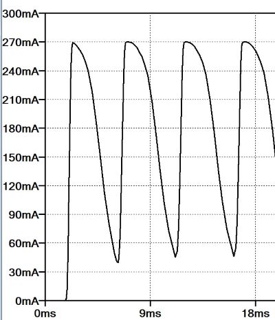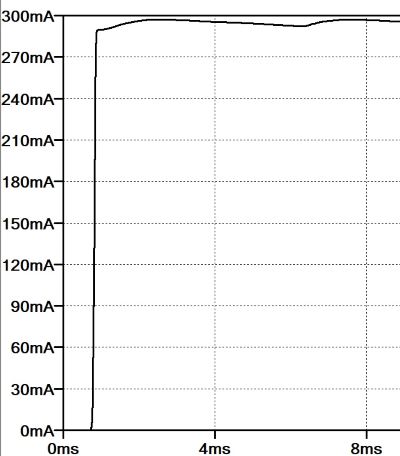 Con una rapida analisi su LTSpice ipotizzando una tensione di alimentazione massima di 6 V, si può osservare una corrente massima di 270 mA che è in linea con quanto ci aspettavamo originariamente.