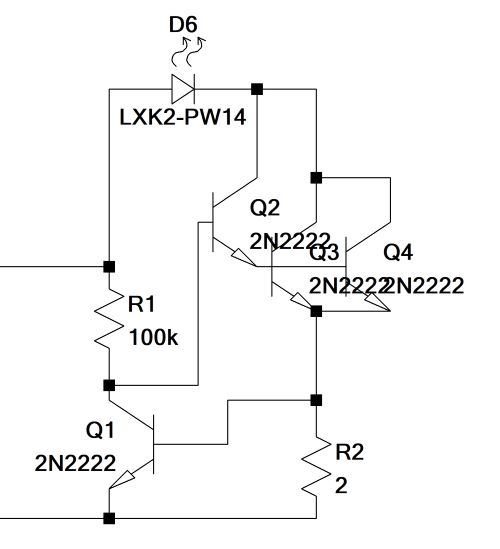 Inoltre aggiungo una piccola curiosità: perché usare un BJT e un MOSFET e non due BJT o due MOSFET? All'ultima domanda rispondo subito. Usare un BJT per Q1 al posto di un MOSFET fa sì che il circuito abbia una minor sensibilità alla tensione di alimentazione. Infatti in un BJT la VBE varia molto poco rispetto ad una variazione della Ic, nei MOSFET non è così. Per l'altra domanda si può tranquillamente usare un BJT al posto di M1, però bisogna tenere conto della corrente di base in polarizzazione. Per come è stato polarizzato è necessario un grande guadagno, perciò si potrebbe sostituire M1 con una coppia darlington di P2N2222. Questa soluzione sulla carta funziona, ma il nostro BJT non è in grado di dissipare tutta la potenza. Una soluzione aggiuntiva potrebbe essere di mettere più transistor in parallelo come nella figura seguente o usare direttamente una coppia darlington come un BDX33C.