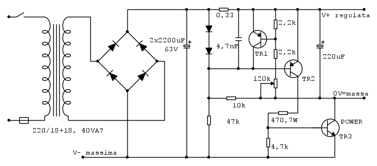Descrivo un mio alimentatore a componenti discreti. Lo schema seguente, incompleto, serve per una prima descrizione: