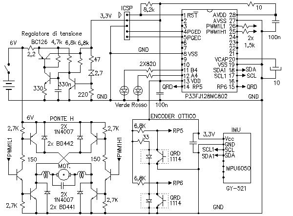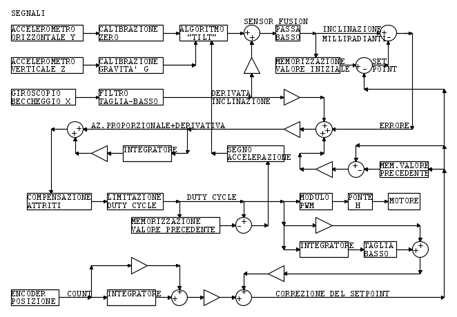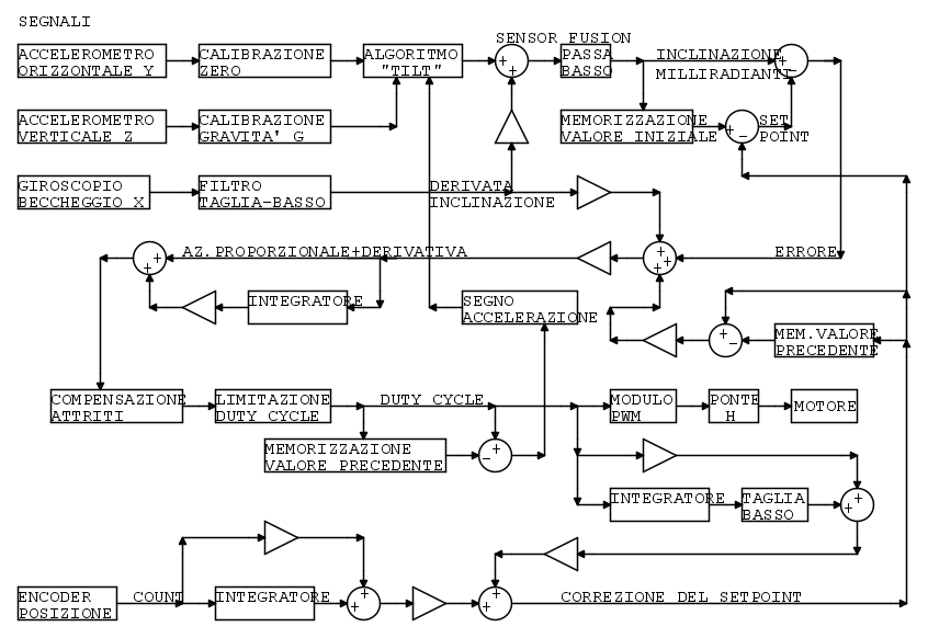 Supponiamo che l'avviamento avvenga in posizione di equilibrio e memorizziamo come riferimento o setpoint l'angolo di inclinazione iniziale, che dovrebbe essere zero o poco diverso. Il sistema di regolazione, ogni millisecondo, misura l'inclinazione corrente e cerca di azzerare lo scostamento dal detto valore iniziale, mediante una azione proporzionale, cui viene sommata una azione derivativa come detto nel paragrafo precedente. In che cosa consiste questa azione? Abbiamo un motore collegato alle ruote tramite una cinghietta di trasmissione, quindi dovremmo modulare la velocità, o la posizione, o l'accelerazione, o la coppia di questo motore? A complicare le cose, il motore viene alimentato in ambo i versi in PulseWidthModulation quindi dobbiamo scegliere fra modulazione a 2 o 3 livelli, con ring armonico libero o con tensione sempre impressa, con induttore o meno, a che frequenza, dead time eccetera. Dopo diverse prove è stata adotatta la soluzione più semplice, con l'aggiunta praticamente trascurabile di un integratore come indicato nello schema.