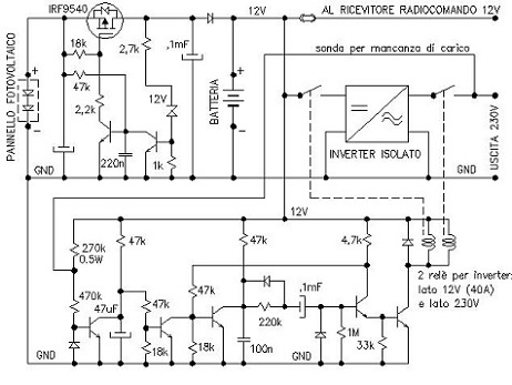 A regime ambedue i relè sono diseccitati, quindi l'inverter è disalimentato e l'autoconsumo degli altri circuiti è molto modesto. Si tratta di un relè di tipo automobilistico da 40 Amp posto sull'alimentazione a 12V dell'inverter, e di un relè più piccolo sull'uscita a 230V. Questo secondo relè serve soltanto per consentire il funzionamento della sonda di carico, e può darsi che non sia necessario con alcuni tipi di inverter. Comunque l'inverter deve essere del tipo isolato, altrimenti bisognerebbe verificare che avesse almeno la massa comune fra entrata e uscita.