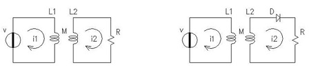 M è il coefficiente di mutua induzione pari a k per la radice di L1 L2. E' chiaro che le incognite i1 e i2 sono le correnti di maglia mentre t indica il tempo. Il prefisso d indica i differenziali delle dette grandezze ma può indicarne anche le differenze finite e come passo di calcolo si assume dt pari a 10 microsecondi. Otteniamo per sostituzione le seguenti formule risolutive del nostro sistema:
