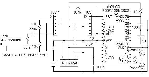 Questo programma è stato compilato con il compilatore C30 versione 3.25 lite student free che ho scaricato dal sito Microchip, e poi riversato con il programmatore Pickit3 tramite il connettore ICSP indicato nello schema, sotto Mplab 8.60.