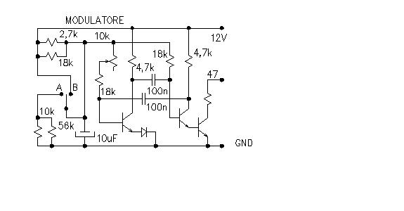 Il trasmettitore per questo rudimentale "radiocomando AFSK" è capace di inviare un segnale modulato con 3 diverse frequenze audio: 263, 313 o 372 Hz che rappresentano i 3 canali di comando On-Off. E' chiaro che le due frequenze estreme coincidono con le frequenze di risonanza dei due filtri A e B; se le ampiezze all'uscita dei rispettivi rivelatori sono circa eguali vuol dire che la frequenza inviata è quella intermedia.