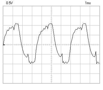 Riporto quì sotto lo schema del circuito che genera le tre frequenze suddette e funge da modulatore, e riporto anche un oscillogramma del segnale audio all'uscita dello scanner: la forma d'onda è distorta ma il funzionamento del radiocomando è affidabile grazie ai filtri.