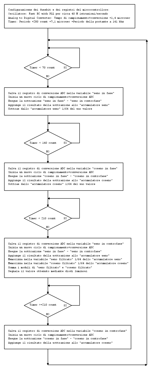 E' stata prescelta una MCU tipo pic32, che presenta un assorbimento ridotto pari a circa 30 mA quindi semplifica il lavoro dell'alimentatore capacitivo da rete. Lo ADC a 10 bit può arrivare teoricamente a 1 Msample/sec e il processore può fare fino a 40 MIPS (milioni di istruzioni al secondo). Quindi direi che non è possibile sovracampionare il segnale analogico in quantità sufficiente per realizzare un vero e proprio filtro selettivo a 141 khz. Per procedere ugualmente con la realizzazione, ho seguito una tecnica semplificata di rivelazione sincrona DIY di cui riporto il diagramma di flusso: