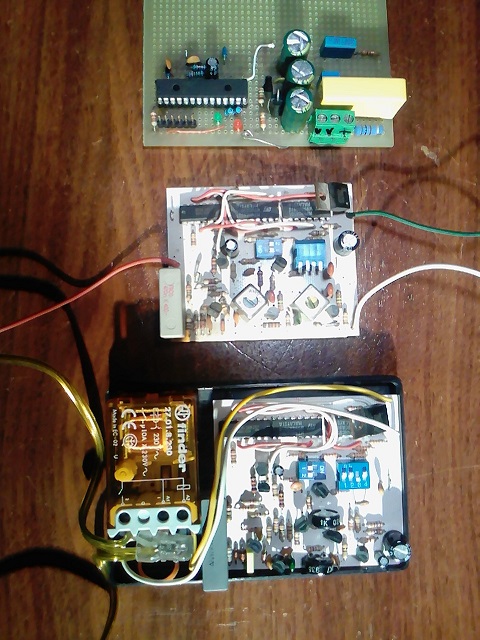 Le unità riceventi sono state realizzate inizialmente con un filtro attivo a componenti discreti, ma in seguito alla diffusione di pompe di calore a inverter, grandi TV color, luci elettroniche e quant'altro, hanno presentato qualche falso intervento dovuto ai forti disturbi presenti sulla rete. Quindi è stata realizzata una nuova versione a circuiti accordati. Ultimamente, avendo il sottoscritto acquisito una certa esperienza con l'uso dei microcontrollori, è sorta l'idea di affidare il tutto a una MCU. Riporto una foto in cui si vedono sovrapposte sia le due versioni precedenti, che la detta terza versione in esecuzione provvisoria su millefori.