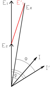Rispetto alla rotazione della f.e.m. risultante ER, segue anche una rotazione della corrente I che diventa I’, dato che l’angolo