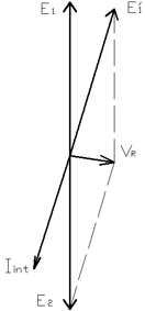 Nel momento in cui la f.e.m. E1 ritarda, nel circuito interno nasce una tensione risultante VR. Questa tensione permette la circolazione di una corrente interna Iint (interna perchè circola nel circuito interno alle due macchine) che si trova quasi a 90° con la tensione VR, poichè il circuito interno è quasi interamente induttivo. Tale corrente si sovrappone alla corrente richiesta dal carico. L’angolo di sfasamento tra la corrente interna e la f.e.m. E2 è un angolo minore di 90°, quindi l'alternatore 2 impegna potenza attiva positiva (cioè erogata), oltre a quella che deve erogare al carico.