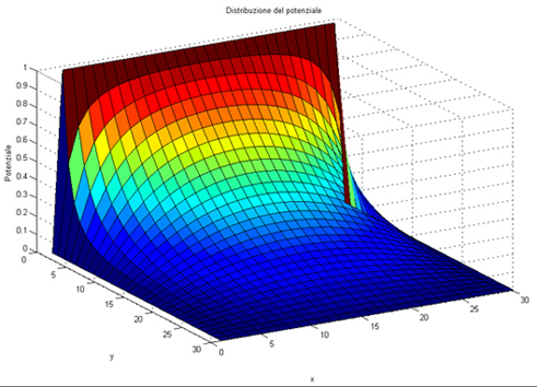 Il codice Fortran 90/95 deve essere salvato in una cartella al cui interno si creerà automaticamente il file Potenziale.txt, contenente la matrice MxN con i valori dei potenziali di tutti i nodi del reticolo associato alla regione piana studiata. I dati del file possono essere inviati in un software qualsiasi in grado di creare una superficie che evidenzia la distribuzione del potenziale.