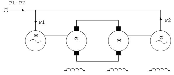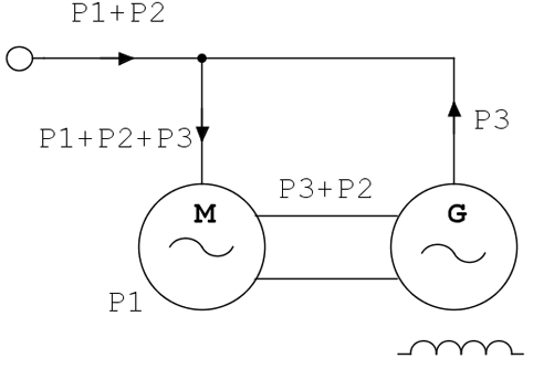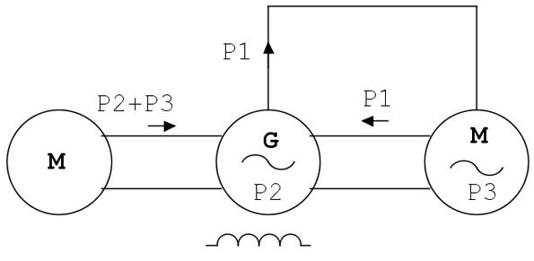 Lo schema prevede due macchine elettriche identiche: un motore e un generatore. Esistono due schemi duali. Nel primo schema le perdite P1+P2 del sistema sono sostenute dalla rete di alimentazione