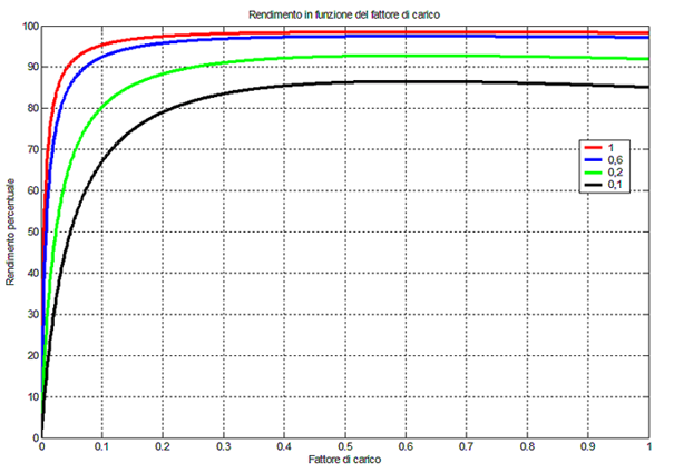 Utilizzando uno script matlab è possibile visualizzare le curve del rendimento convenzionale in funzione del fattore di carico e parametrizzate secondo il fattore di potenza.