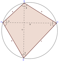 Per il teorema del coseno, ricordando che in un quadrilatero inscritto gli angoli opposti sono supplementari, possiamo scrivere: